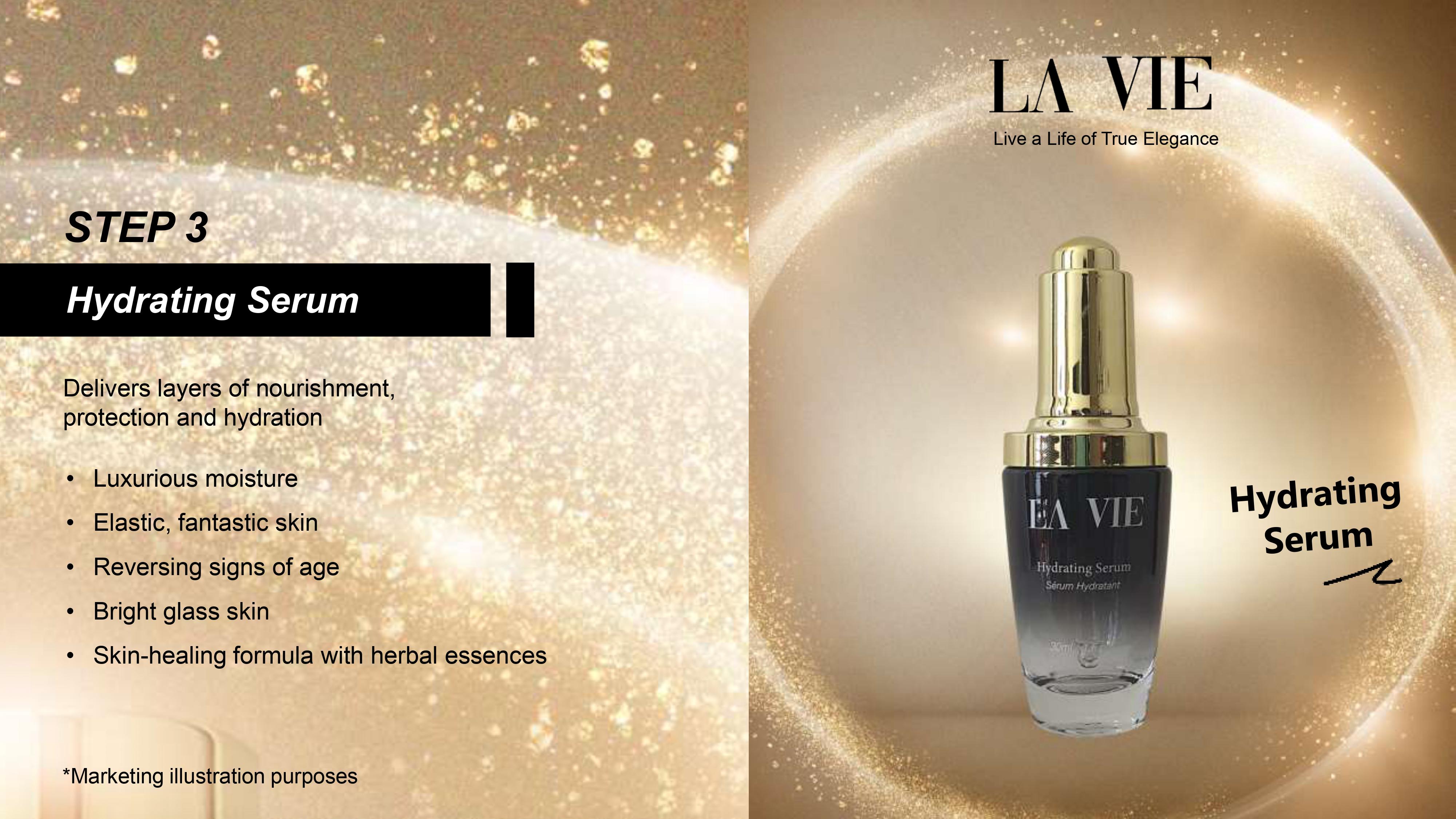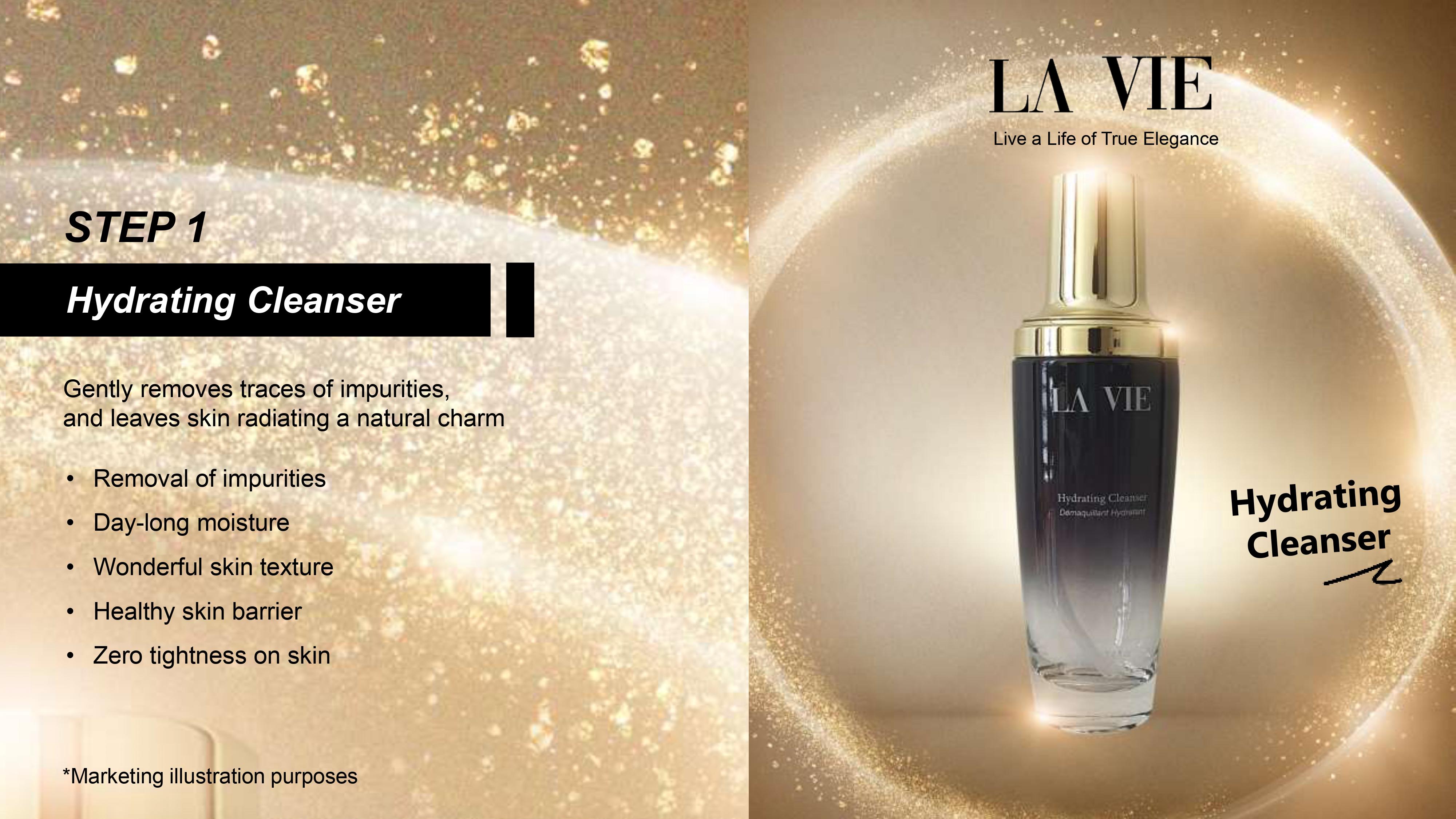 After cleansing, apply Hydrating Toner onto the face with a cotton pad morning and evening.