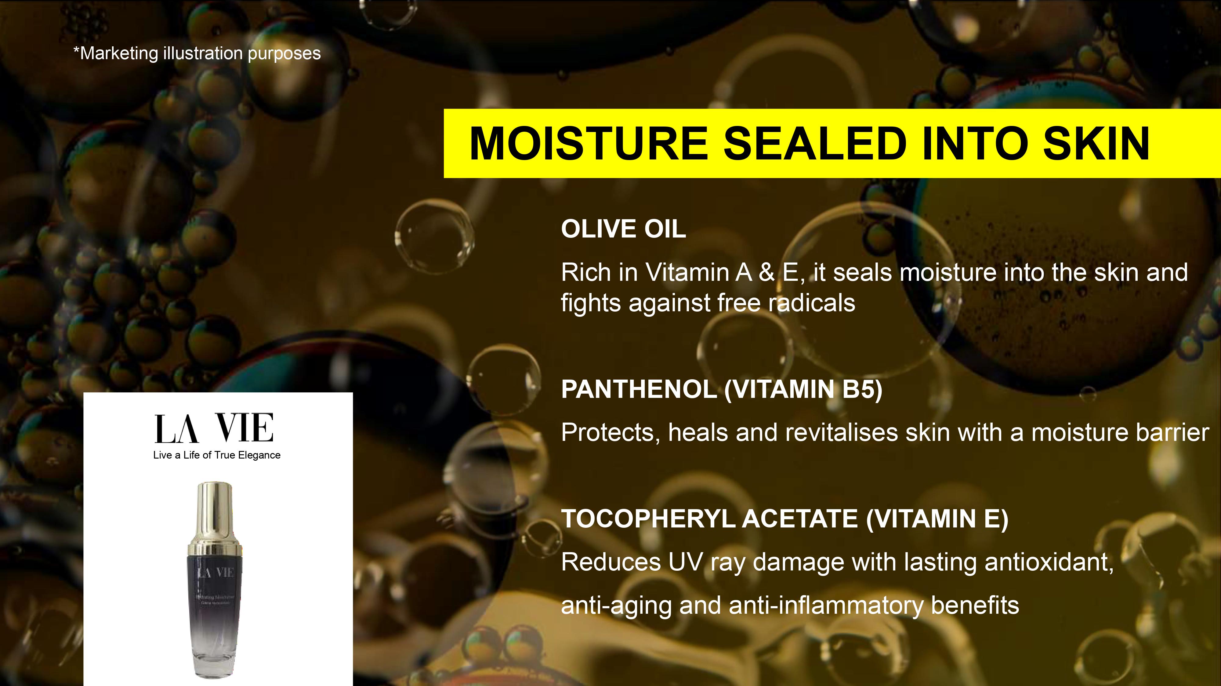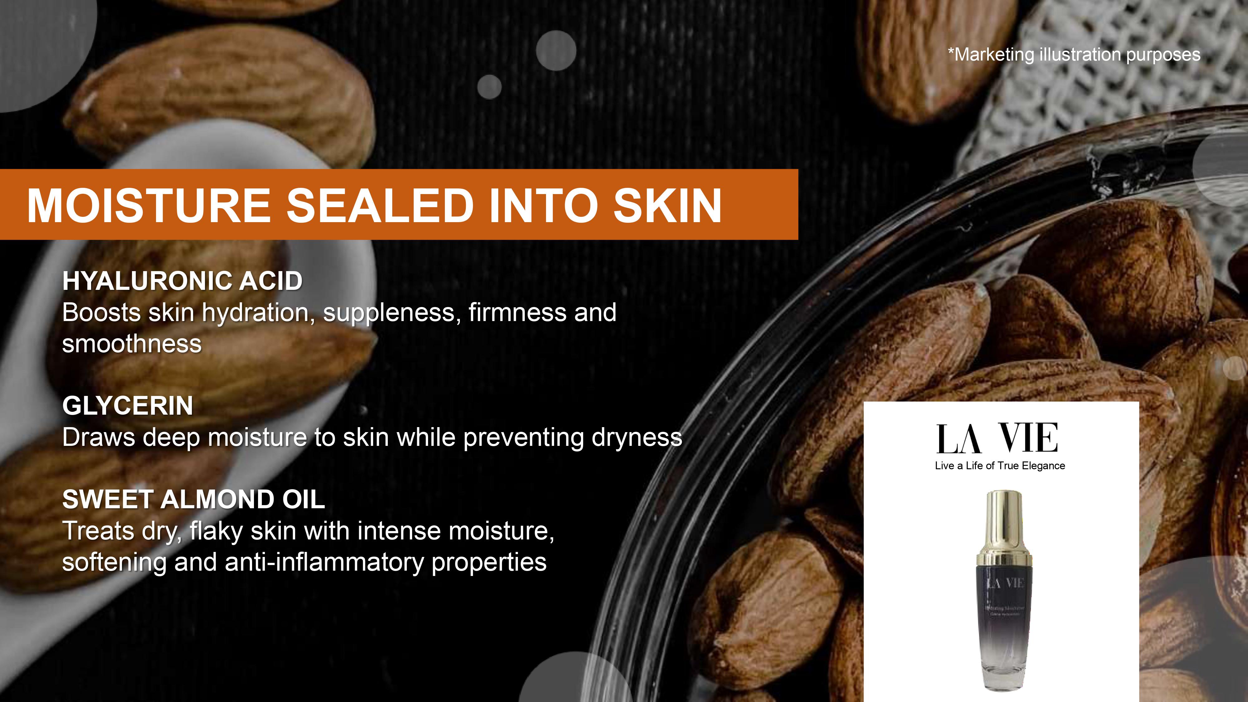 Meningkatkan hidrasi, kelembutan, keanjalan dan kelicinan kulit.