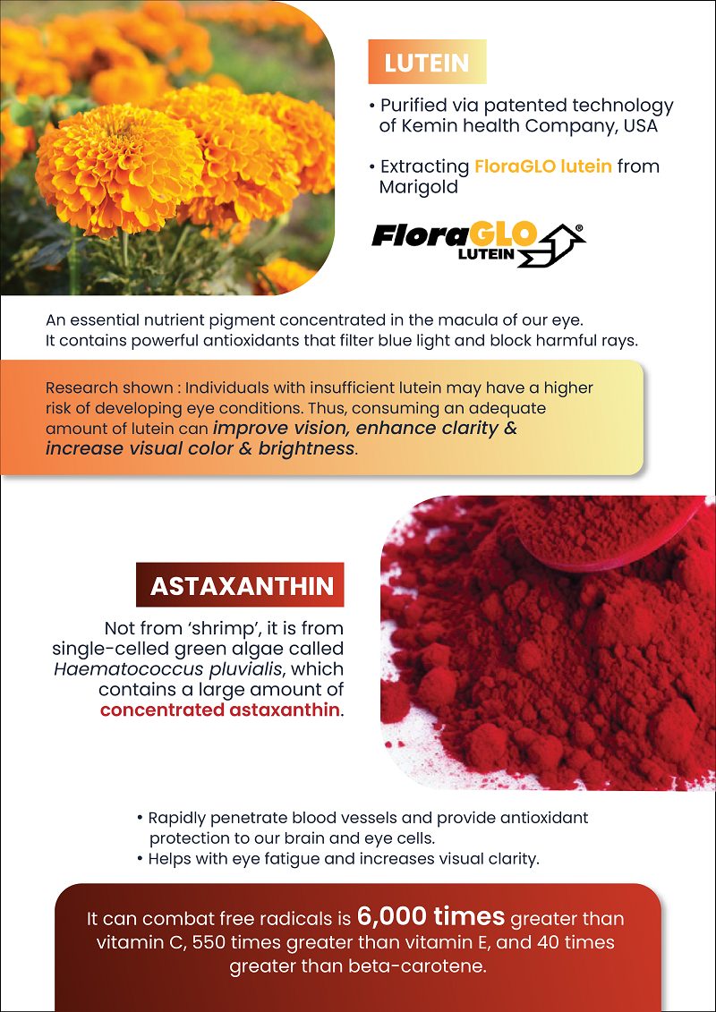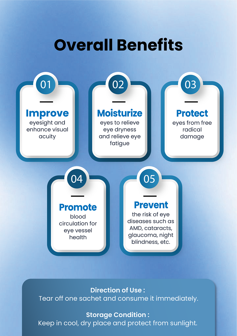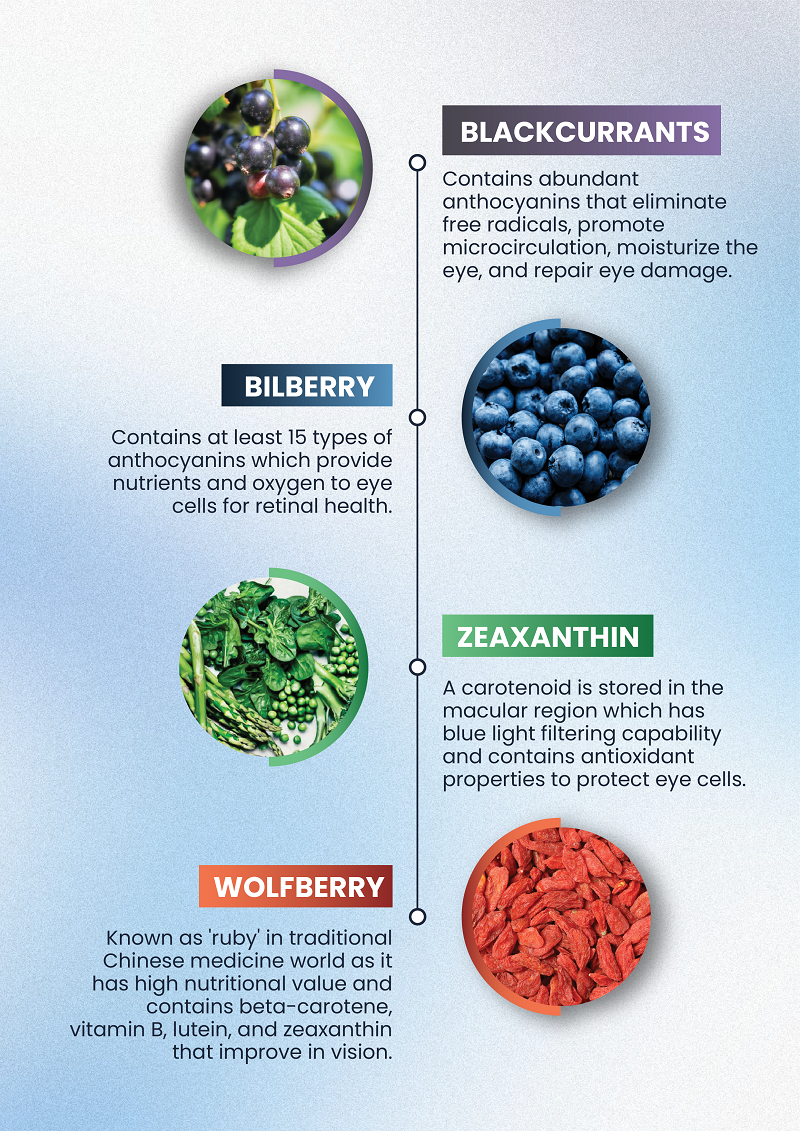 Deionised Water, Sorbitol, Glycerin, Blackcurrant Juice, Wolfberry Powder, Bilberry Powder, Gelling Agent (Konjac), Tara Gum, Premix Vitamin (Vitamin C, Vitamin A+D3, Vitamin E, Vitamin B5, Vitamin B6, Folic Acid, Biotin, Vitamin B12), Lutein, Astaxanthin, Zinc Oxide, Sucralose, Zeaxanthin, Copper Sulphate and Selenium.